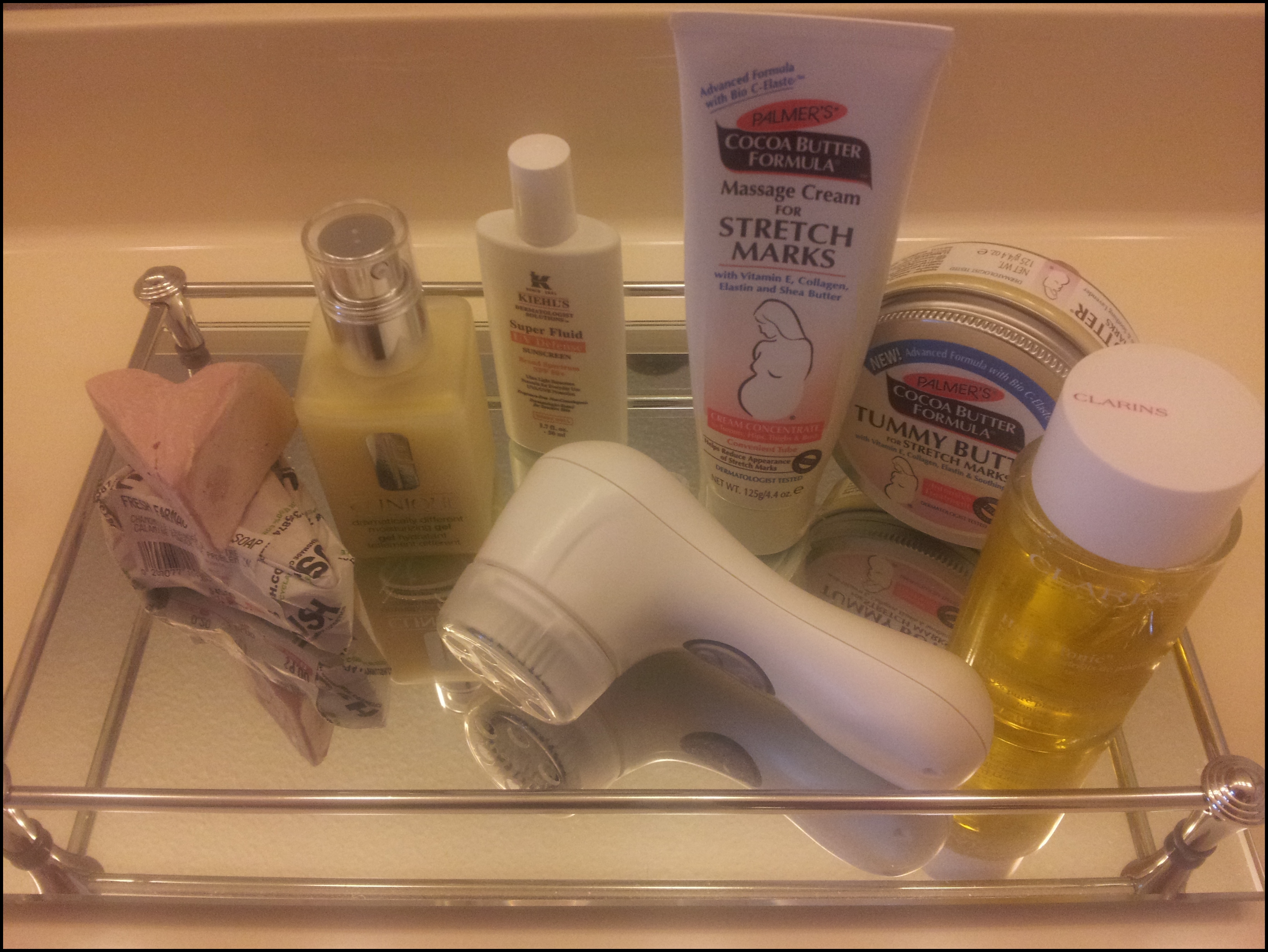 Para o corpo ( barriga, costas, peito e bumbum) uso o Cocoa Butter da Palmers sempre que vou ficar em casa ( pois ele é mais melequento) e o Massage Cream sempre que tenho que sair. Logo no início da gravidez comprei o Óleo da Clarins que é muito famoso para esses fins. Mas o cheiro de Gerânio e Alecrim é muito forte,além de ser bem carinho pra se usar frascos e mais frascos e por tudo isso, apesar de hidratar muito, uso raramente.